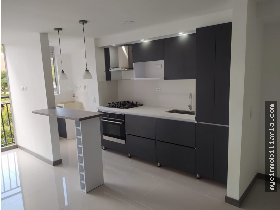 Apartamento en venta en La Doctora, Sabaneta de 58 m², cuenta con 3 habitaciones, 2 baños, cocina moderna con barra americana, sala comedor, balcón y zona de ropas con iluminación directa. Los pisos de las alcobas son en madera laminada y el cielo falso en drywall con ojos de buey, lo que brinda un ambiente cálido y moderno.